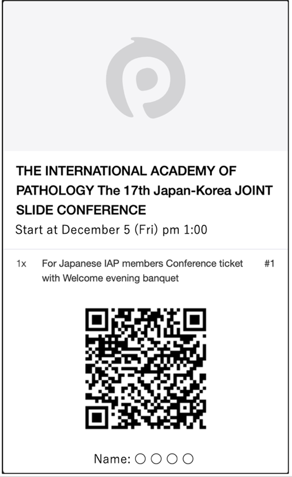 Following completion of online payment, participants will have received an event ticket (including QR code; see sample below). Please present this ticket to the reception staff, either displayed on a smartphone/tablet or in a printed form.